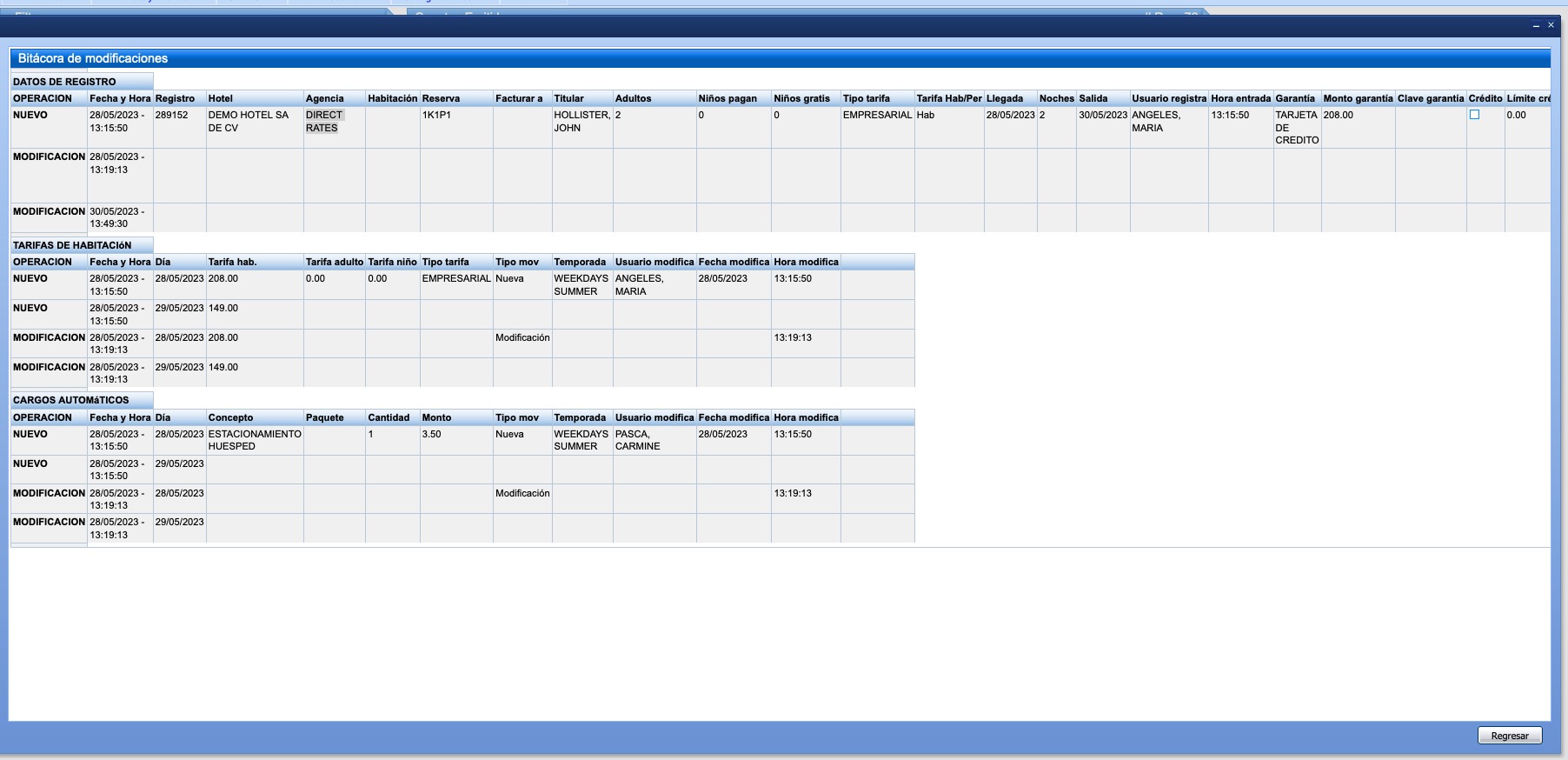- Verificar la Bitácora de Cambios del registro: se podrán revisar todas las transacciones sobre el registro desde que se realizó check-in.