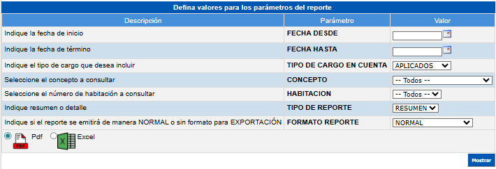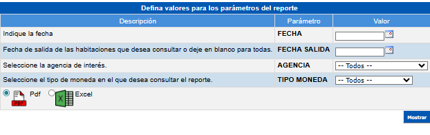 Estados de Cuentas Activas a Fecha Determinada | Este reporte permite consultar el estado de las cuentas activas de huéspedes y folios varios a una fecha específica. Su finalidad es entregar una fotografía del estado financiero de las cuentas abiertas en el sistema en un momento determinado. Para generar el reporte, el usuario debe definir los siguientes parámetros: |