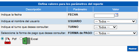 Movimientos de Caja por Formas de Pago | Este reporte mostrará los movimientos del día agrupados por forma de pago. Para generar el reporte, la pantalla que contiene los parámetros se muestra a continuación: |
