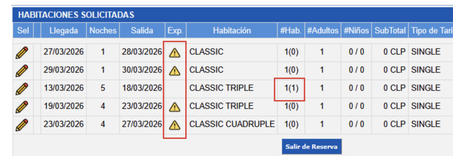 - 1(1) indica que la reserva es por 1 habitación y el número entre paréntesis indica que ya se registró.