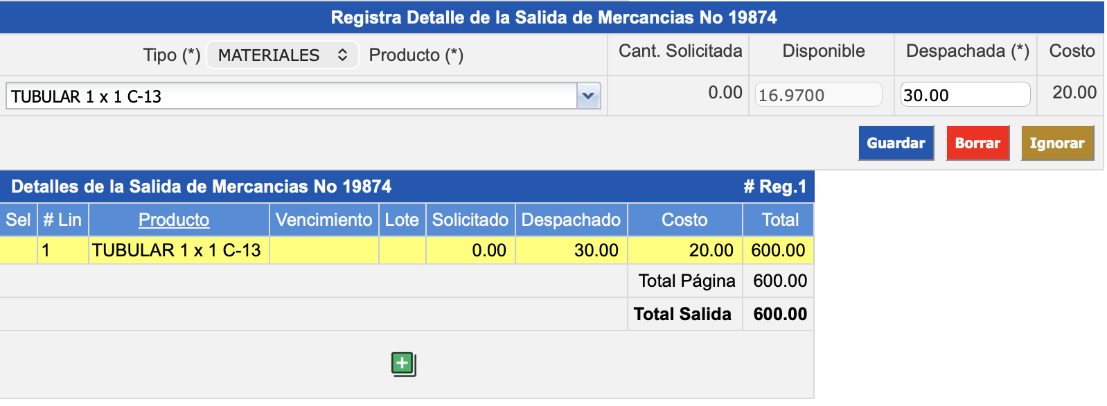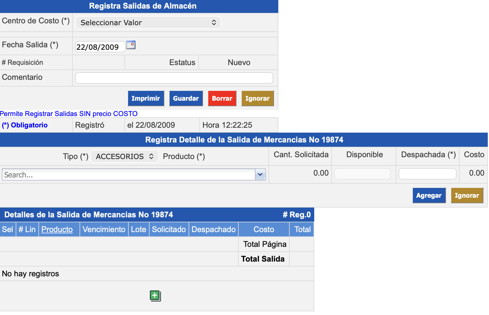 Nuevo: Sólo esta capturado el encabezado de la salida o despacho de mercancía, no tiene registrado detalles.