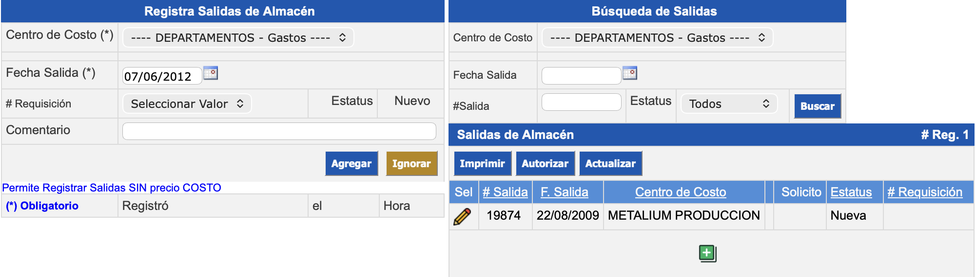 Estatus de Autorizado. Una vez realizada la actualización de la salida no se puede modificar la salida. Es importante que tenga en consideración que al actualizar se afecta el kardex.