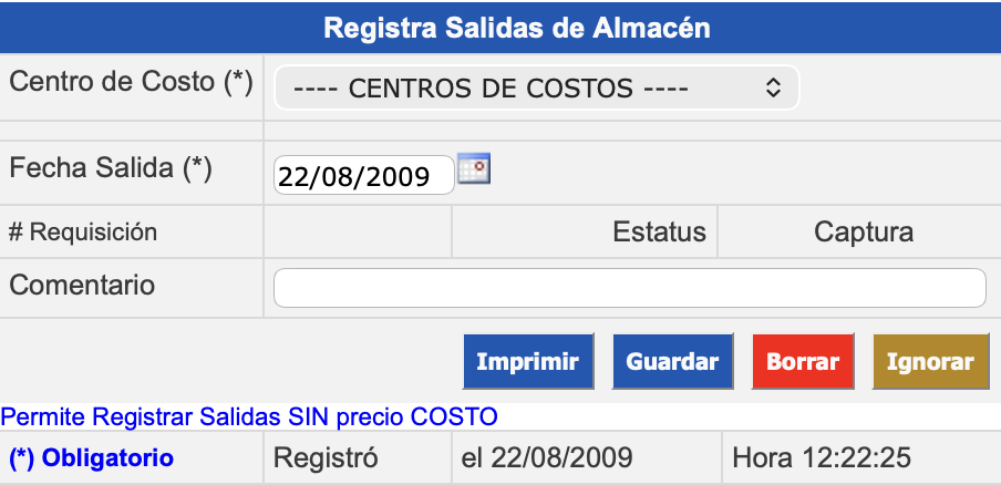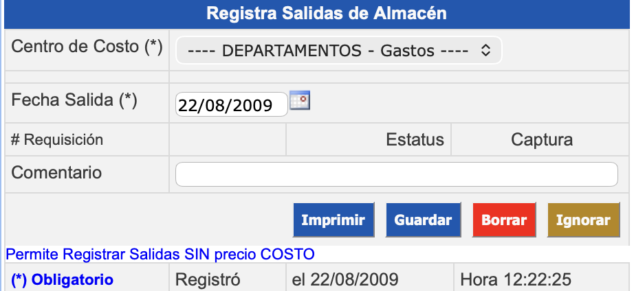 Administración → Control Inventarios →Entradas y Salidas de Almacén → Registra Salidas del Almacén.