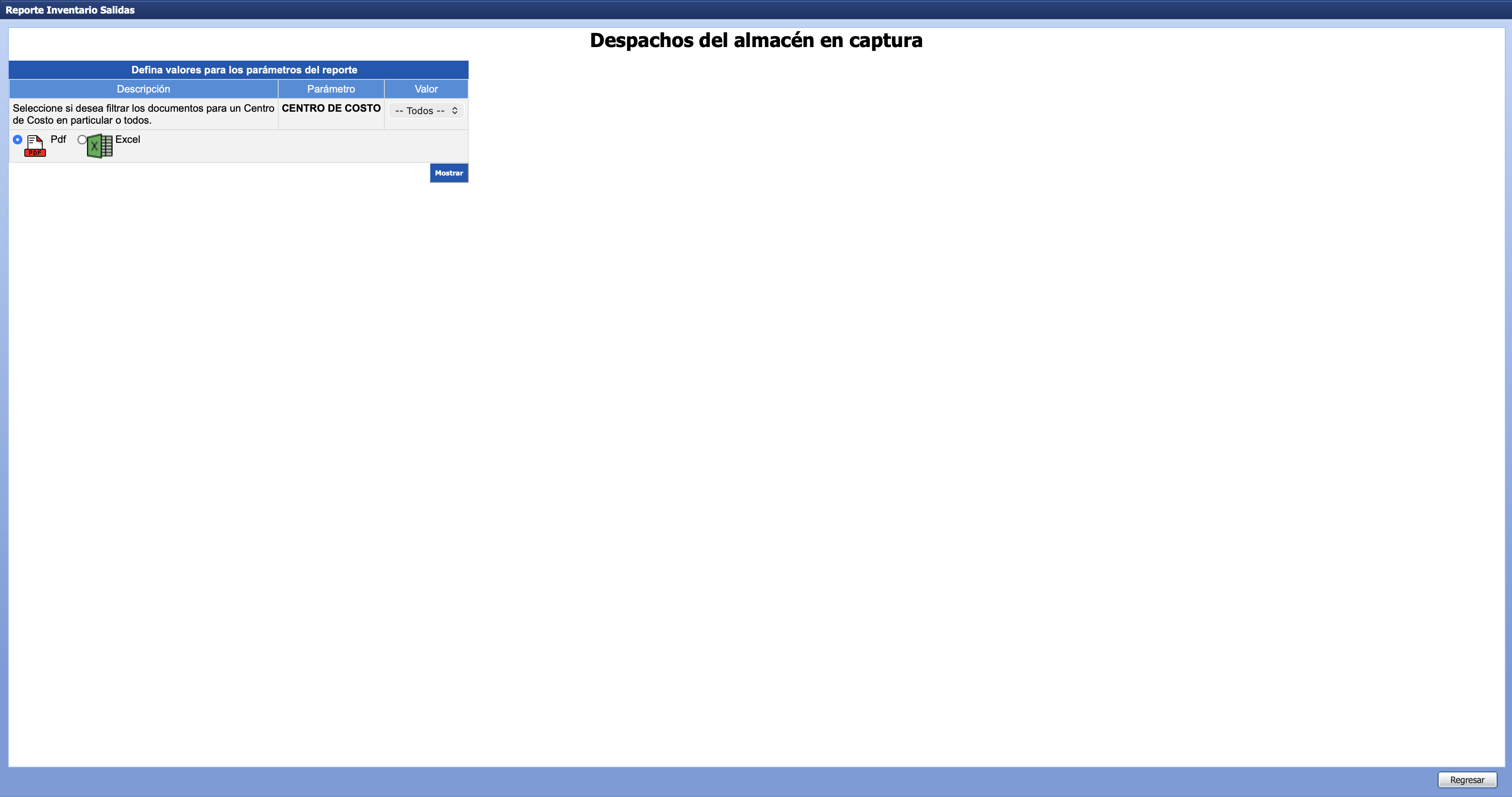 Regresar, de esta manera, volverá a la pantalla inicial de Registra Salidas de Almacenes.