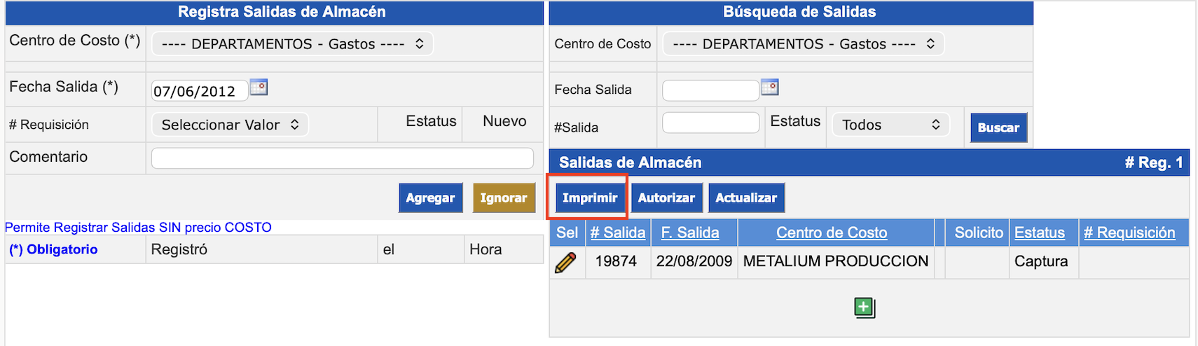 Imprimir desde la sección Salidas de Almacén:
